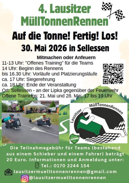 Am 30. Mai 2026 steigt das 4. Lausitzer MüllTonnenRennen in Sellessen, ein actionreiches Event für Teams und Zuschauer! Zwischen 11 und 13 Uhr können Teams beim offenen Training ihre Fahrtechnik testen, bevor um 14 Uhr das Rennen startet. Bis etwa 16:30 Uhr laufen Vorläufe und Platzierungsrennen, gegen 17 Uhr folgt die Siegerehrung und gegen 18 Uhr endet die Veranstaltung.