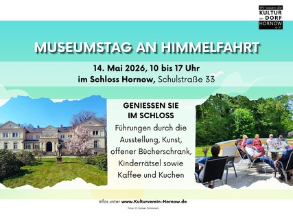 Kennen Sie schon die bewegte Geschichte des Hornower Schlosses? Wenn nicht, dann nutzen Sie die Gelegenheit, unsere Ausstellung dazu zu besuchen und finden Sie alles - gern auch in einer Führung - heraus! Sie haben unsere historische Postkartenausstellung noch nicht gesehen? Auch dazu haben Sie nun die Gelegenheit. Außerdem haben Sie die Möglichkeit, sich die aktuelle Ausstellung "Zwischen Epochen" von Sophia Bornhagen anzuschauen. Die Künstlerin ist freischaffende Malerin, Plastikerin und Kunsthistorikerin und zeigt im Schloss Hornow gegenständliche Ölmalerei. Ihre figürlichen Darstellungen, Stillleben, landschaftlichen und architektonischen Motive nehmen dabei mittelbar Bezug auf Schloss und Park in Hornow sowie auf die Malerei Max Rabes. Für die Kinder gibt es eine kleine Schnitzeljagd zum Schloss. Auch unseren offenen Bücherschrank können Sie besuchen! Der Eintritt ist frei, der Verein freut sich über eine Spende! Für das leibliche Wohl gibt es Kaffee, Kuchen/Waffeln und Stullchen.