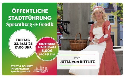 Begeben sie sich auf eine spannende Zeitreise mit Jutta von Kittlitz und entdecken sie Spremberg aus einer ganz besonderen Perspektive! In historischer Gewandung bringt ihnen Jutta von Kittlitz Geschichte, Anekdoten und Geheimnisse der Stadt Spremberg näher – unterhaltsam, lebendig und mit viel Herz!