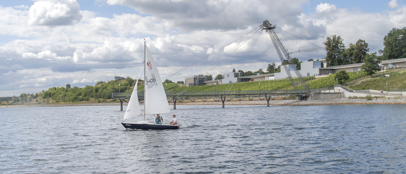 Segelboot vor der Seebrücke und dem Hafen in Großräschen, Foto: Nada Quenzel